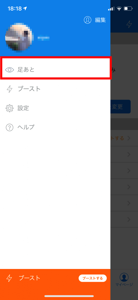 そこを押すと横からメニューがあらわれ「足あと」を見ることができます。
