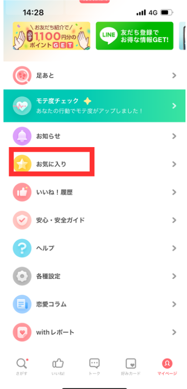 withの「お気に入り」機能は、気になる相手を後でチェックしたい時に便利な機能です。