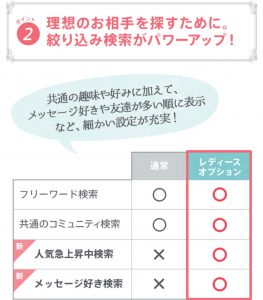 レディースオプションでは絞り込み機能が更に充実し、理想の相手と出会いやすくなります。