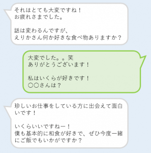 このメッセージの肝は、食べ物の話にして話を合わせて、一緒にご飯に行きたいと誘うこと!