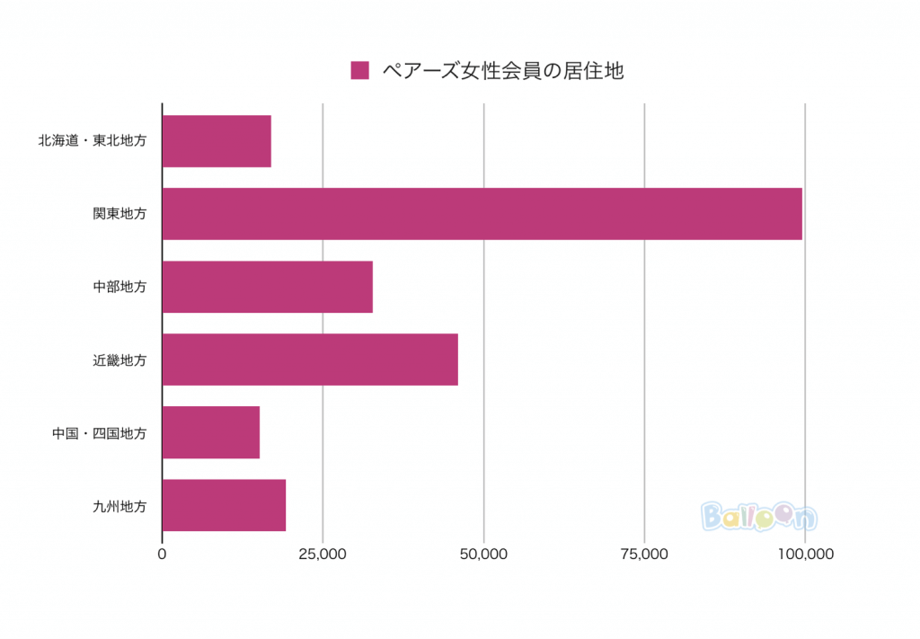 やはり関東地方が圧倒的なユーザー数を誇っています。さらに一番会員数の少ない中国・四国地方の会員でも20,000万人以上の登録者がいることからも、様々な地域でペアーズが利用されていることがわかります。