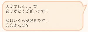 (男性の方は返信に困らないように、相手が返信に困りそうだなと思ったら何か質問をしてくれると助かります。)