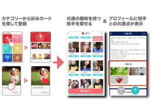 登録した好みに基づいて相性の良いお相手をピックアップしてくれます。様々なカテゴリーのカードがあるので、共通点が多い相手を探しやすいです。