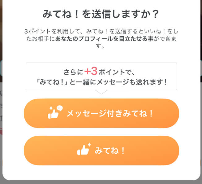 いいねを送ってもなかなかマッチングしない時にみてねを送るとあなたのプロフィールを目立たせて、お相手に気づいてもらいやすくなります。