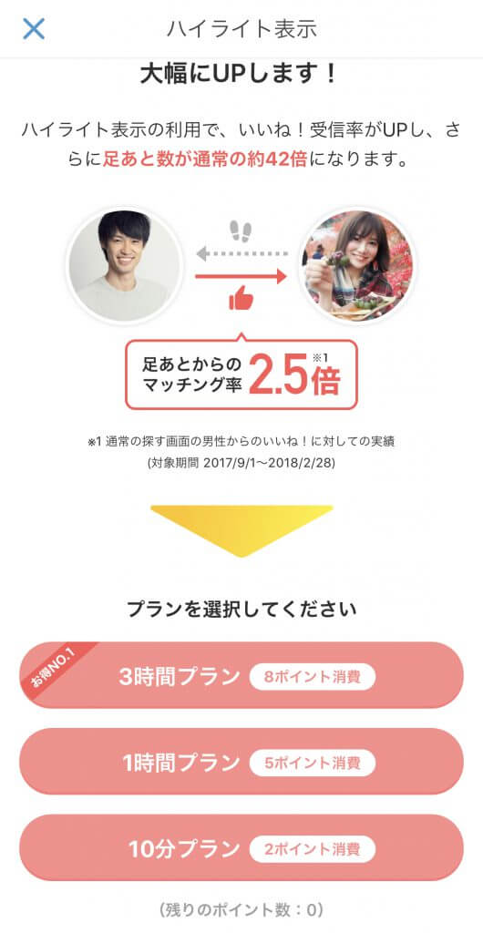 ハイライト表示はポイントを消費して、一定時間お相手の検索画面上部に優先表示してくれたり、本日のピックアップに優先表示してくれる機能です。