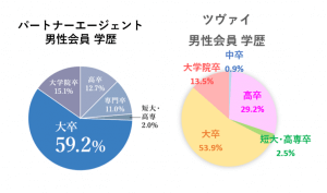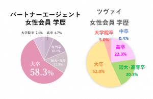 大卒以上の会員の割合はパートナーエージェントは66%、ツヴァイは57%、ゼクシィ縁結びカウンターは60%なので良くも悪くもないという結果です。