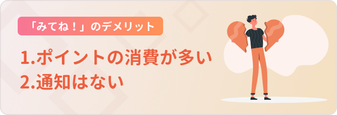 ポイントを使って「みてね!」を送るほどの熱量が伝わればマッチングすることもありますが、何度アピールしても振り向いてくれないお相手もいるため、消費ポイントを無駄にする可能性が高いです。