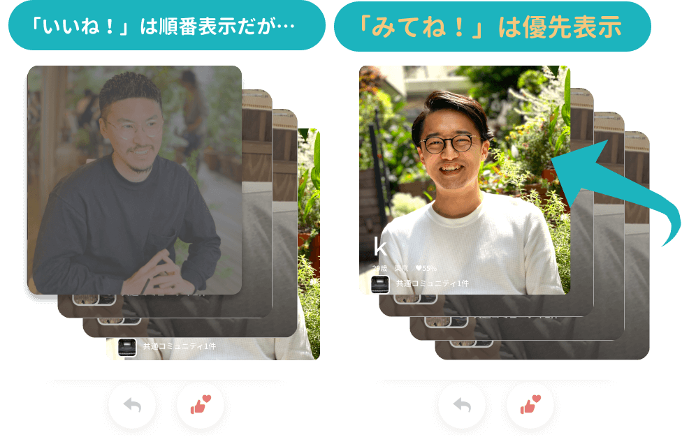 また「みてね!」に気づいたとしても、一度プロフィールを見てマッチングに至らなかった相手に反応することはほぼないでしょう。