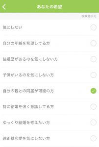 例えば、「結婚するときに絶対に譲れないこと」「親との同居が必要か」「親との同居が可能かどうか」など、結婚を前提に出会うからこそ知りたい項目が揃っています。