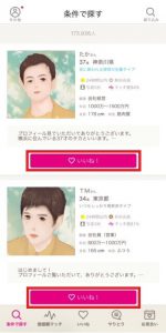 「条件で探す」や「価値観マッチ」で気になるお相手を見つけたら、次のステップは「いいね!」でアプローチです。