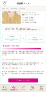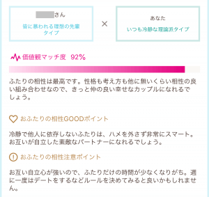 価値観マッチの内容は「マッチ度」「相性のいいポイント」「注意するべきポイント」などが書かれており、デートやメッセージの時に参考にすることができます。
