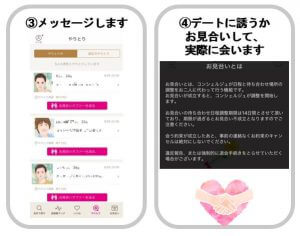 お相手を探してメッセージをして出会う!という流れです。