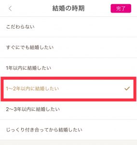 例えば、結婚を1~2年以内にしたいと考えている人と出会いたい場合は、結婚希望時期の選択をして絞り込むことができます。