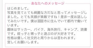 ちゃんと私のプロフィールを見てなぜ出会いたいと思ったのか、写真も内面も触れているのがGOOD!