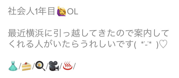 引っ越してきたから案内してほしい、という一文だけでTinder(ティンダー)を始めた動機何を求めているのかがわかるのが良いですね。