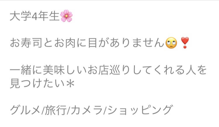 若い女子というだけでLIKEは止まらないとは思いますが…好きな食べ物を書いていると相手も誘いやすいです!