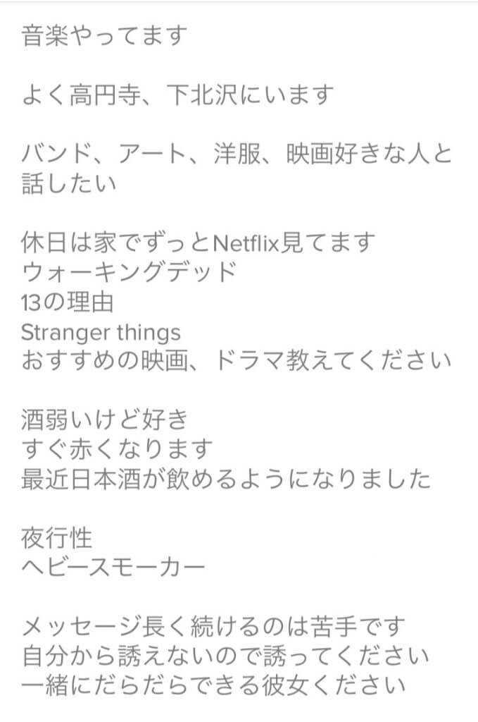 Tinder(ティンダー)は他のマッチングアプリと比べて写真での第一印象で決まりやすいので、自己紹介文も短めです。中には何も記入せずにプロフィール写真だけ載せている人もいます。