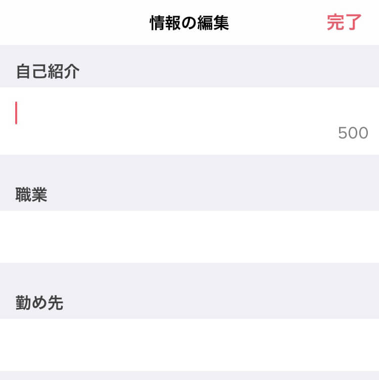 自己紹介以外にも、職業・勤め先・学歴は別で記入する欄があり、これらはスワイプ画面で写真と一緒に表示されるので記入するとベストです!
