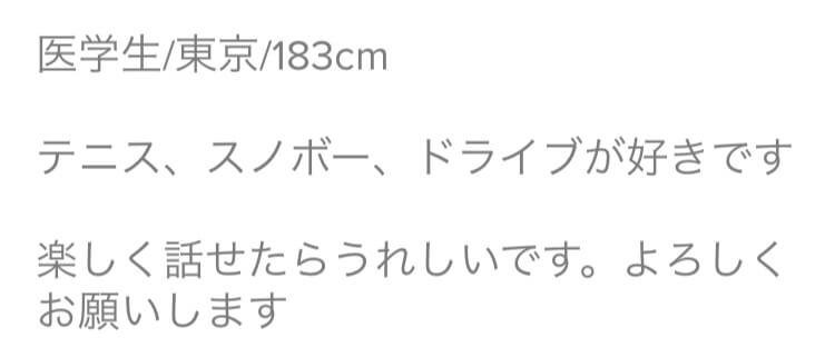 Tinder(ティンダー)はマッチング率がとても高いので、その中からどんな人と出会いたいのか、どのように使いたいのかを書くと効率よくそれに合った人が見つかります。