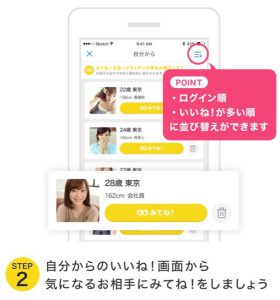 2.自分からの「いいね!」画面から気になるお相手に「みてね!」をしましょう。