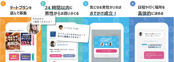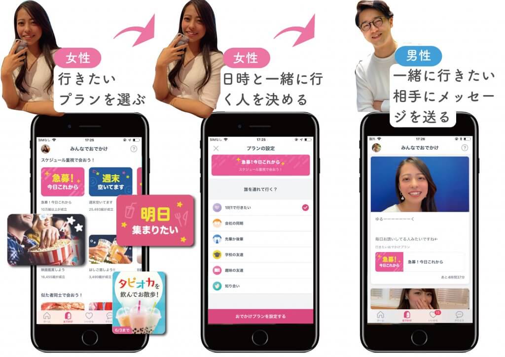 また、フットワークの軽い男女が多く気軽に出会えるのもタップルの特徴。「おでかけ機能」を使えばその日のうちに簡単にデートの約束ができます。