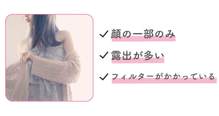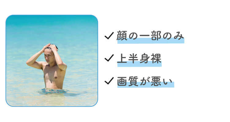 男女ともに、自撮りではなく他人が撮ったもの・笑顔の写真が好印象です。自撮りや真顔・顔がよくわからないものはマッチングしづらいので避けましょう。