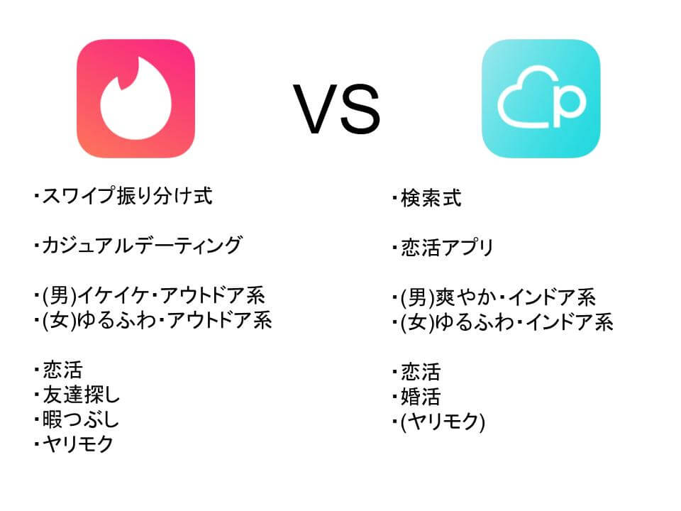 | 使い方 | プロフィールをスワイプして振り分け型 | 検索して相手を見つける型 |