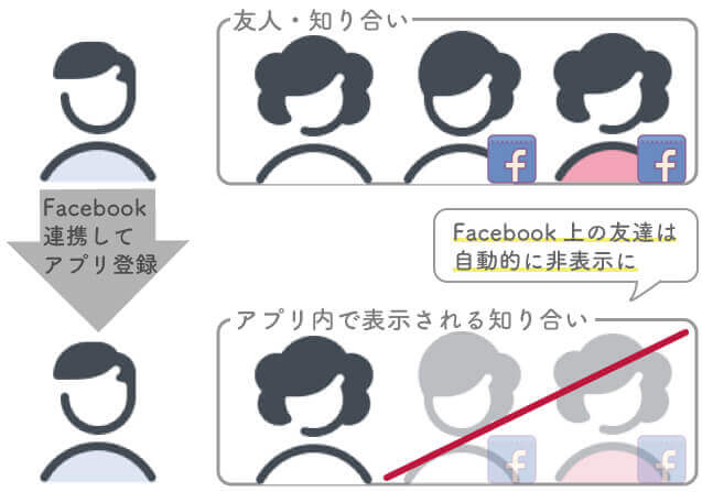 Facebook連動で登録したマッチングアプリでは、Facebookの友達同士がお互いに表示されません。つまりFacebookの友達が多い人ほど、知り合いにマッチングアプリをやっていることがバレないという仕組みです。