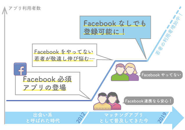 Facebook利用者は減少傾向にあり、特に10,20代のFacebook離れは勢いを増しています。またマッチングアプリが安全に恋活できるというイメージの浸透もあり、Facebook連動なしでも登録ができるようになりました。