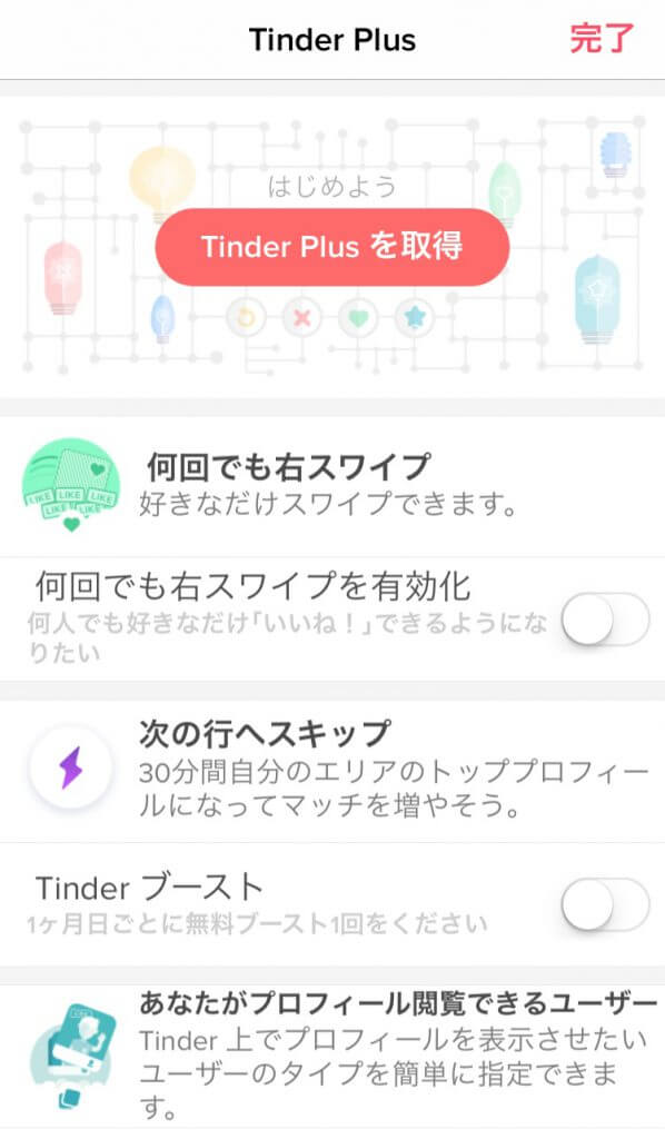 するとこんな画面が出てくるので、一番上のTinderPlusを取得をタップ!