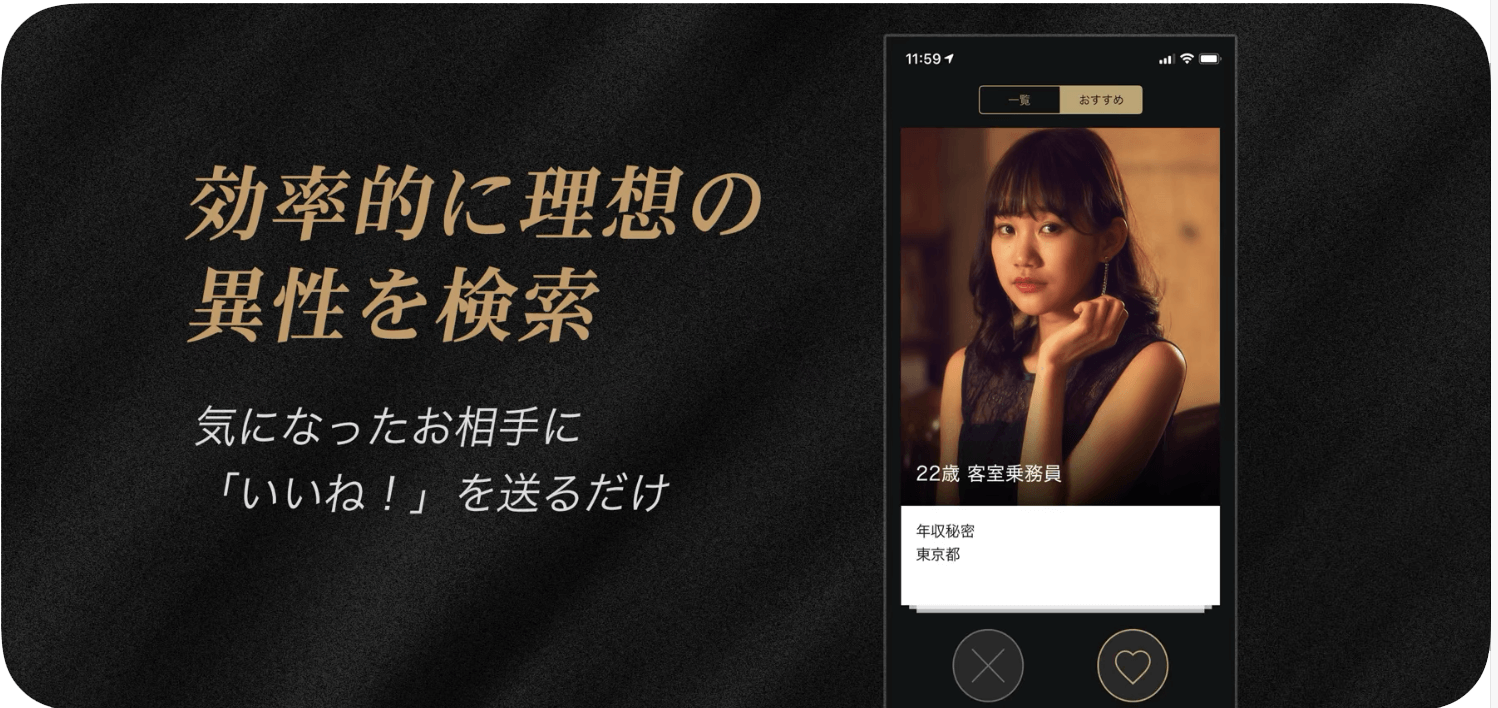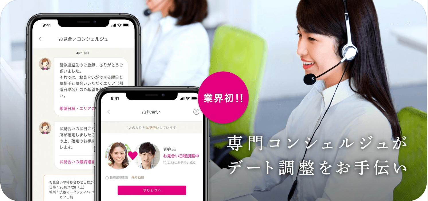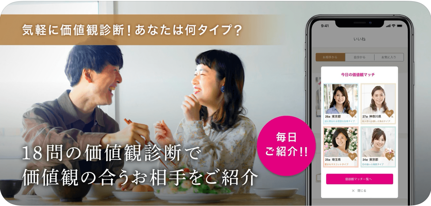 18の質問から価値観を診断し、自分に合った相手を毎日4人紹介してくれます。また、コンシェルジュが初回デートのセッティングをしてくれるサービスもあります。