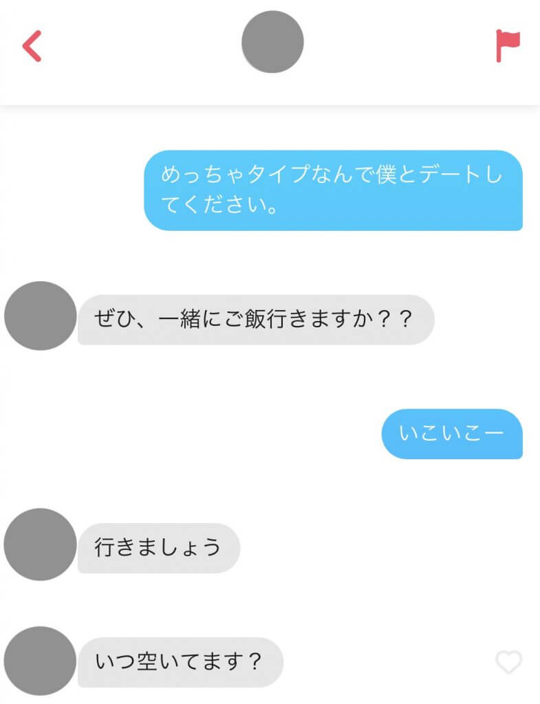 ライクしてから1日ほどでマッチングしたので、すぐに「めっちゃタイプなんで僕とデートしてください。」とメッセージを送りました。