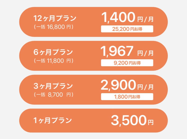 12ヶ月プランだと1,400円/月と長期プランになるほどお得になっています。