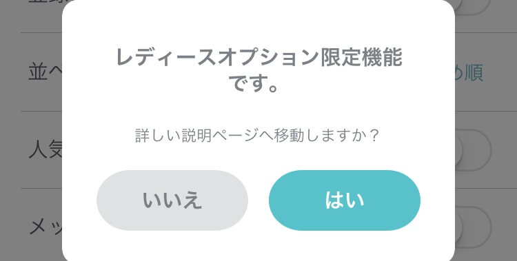 3.「レディースオプション限定機能です。詳しい説明ページへ移動しますか?」で「はい」を選択