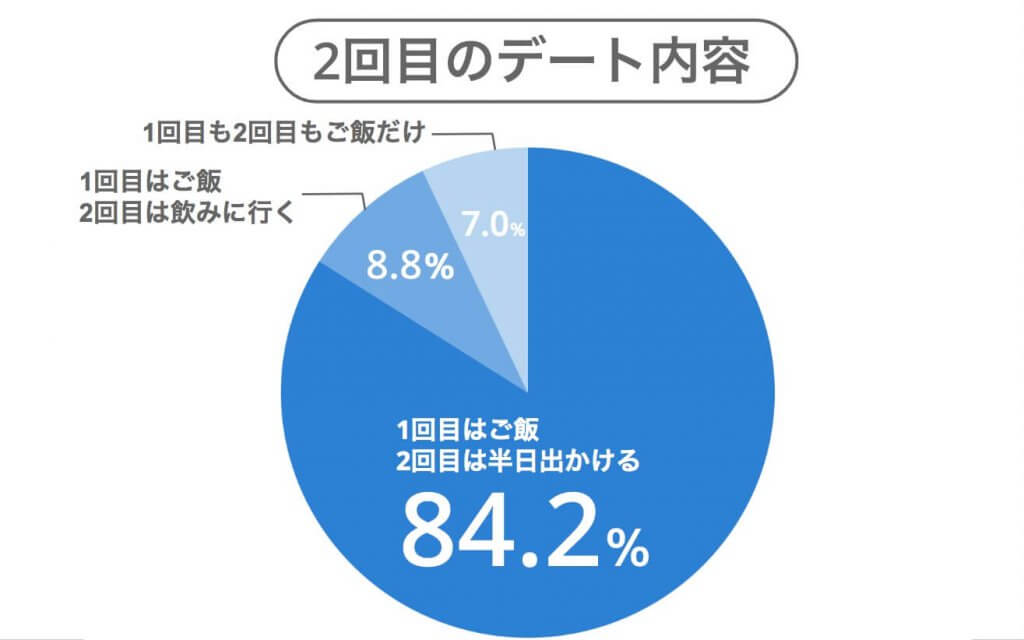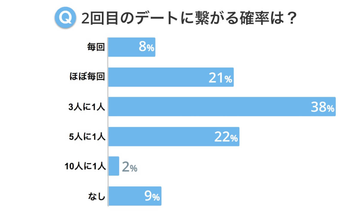 マッチングアプリ利用者の約半数がマッチングしてから2週間以内にデートしています。また、デートの誘いは男性からしている場合がほとんどでした。男性のみなさんはマッチング後2週間を目安にデートに誘いましょう!