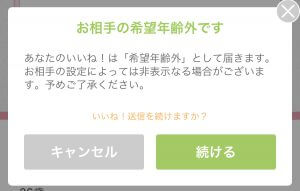 自分の年齢が対象外だと設定しているお相手に「いいね」しようとすると、ポップアップが表示されます。