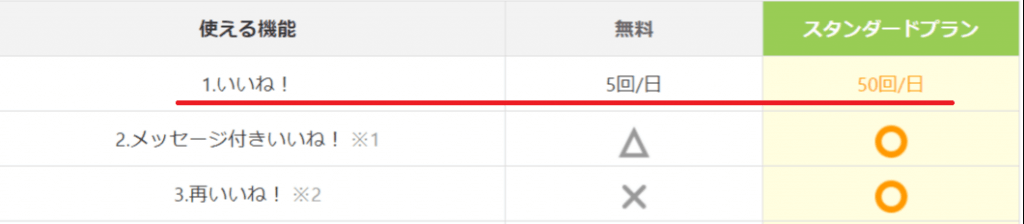 いいねできる回数は公式では、無料会員5回/1日・有料会員50回/1日となっています。