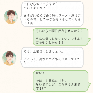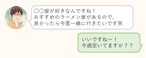 ラーメンの話題で盛り上がり、流れでデートのお誘いをしてもらいました。
