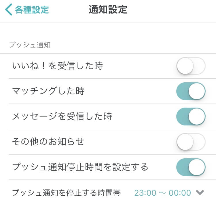 通知設定で受信したい通知項目をカスタマイズしたり、プッシュ通知の場合は通知を受信したくない時間帯を設定することもできます。