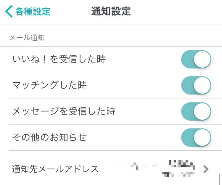 3.メール通知で「連絡先メールアドレス」を設定し、オンにしたい項目を右にスライド、オフにしたい項目を左スライドする