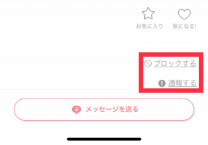 お相手のプロフィールを一番したまでスクロールすると、「ブロックする」と「通報する」があります。