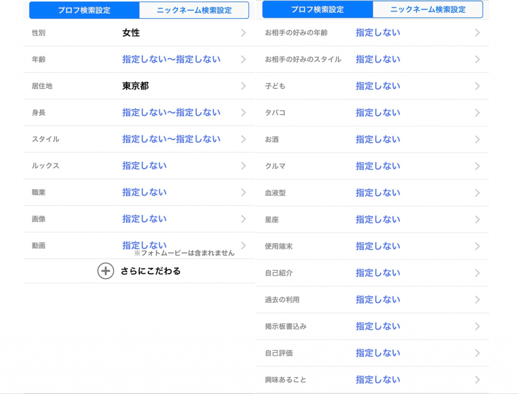 お相手に求める条件を指定することができます。年齢や身長からタバコ、お酒などの条件を設定します。