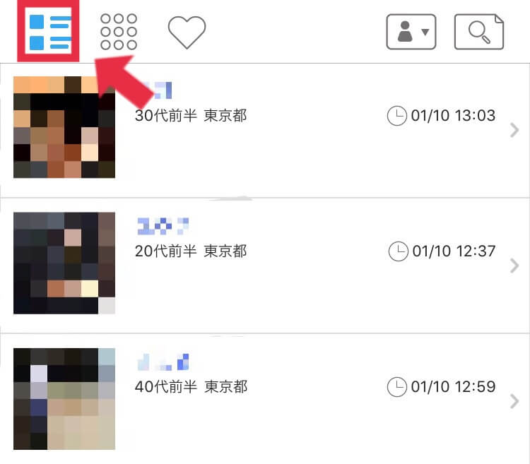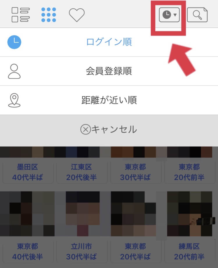 アクティブな会員を探したい場合はログイン順、新規会員を探したい場合は会員登録順、近くの人と出会いたい場合は距離が近い順、などと用途に合わせて使い分けてみましょう。