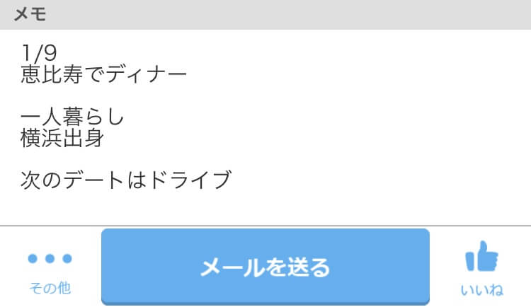 例えば、相手の好きな食べ物だったりよく行く場所だったり、メッセージのやりとりをしている中でゲットした情報をメモするのに使ったり、デート内容をメモしたりなどに活用できます。