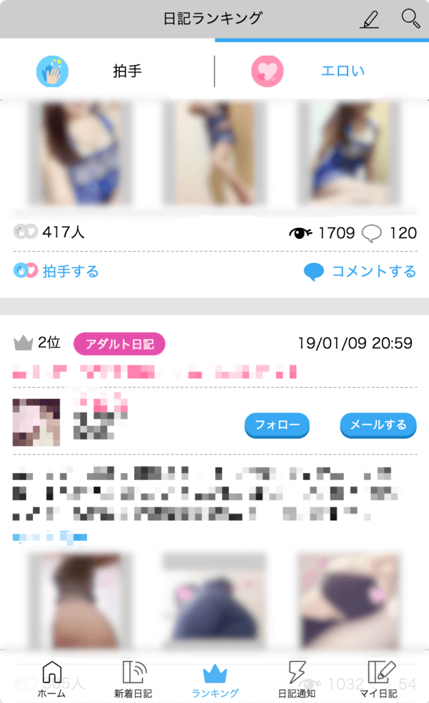 「ランキング」は「拍手」と「エロい」があり、「拍手」ではピュアな内容の日記のランキング、「エロい」ではアダルトな日記のランキングを見ることができます。