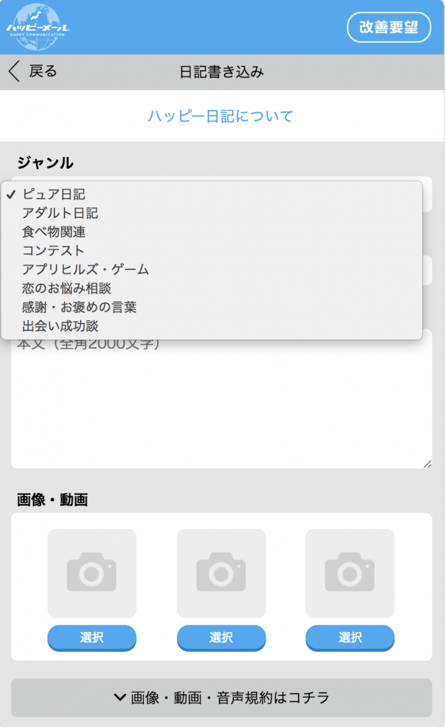 「日記の書き込み」は様々なジャンルの中から選ぶことができ、画像や動画、音声も添付することができます。