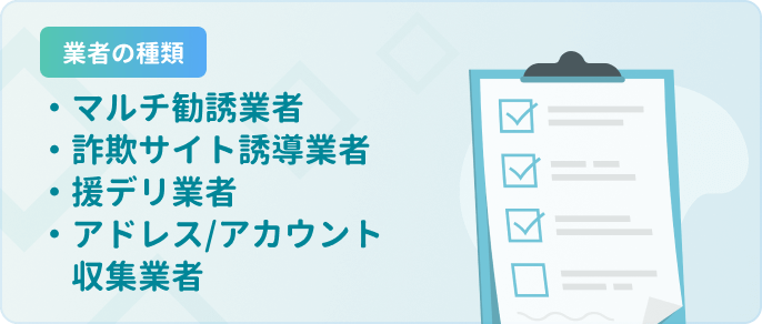 対して業者はマッチングアプリや出会い系サイトの運営とは全く関係がなく、詐欺や勧誘を目的として利用している会員のことを言います。