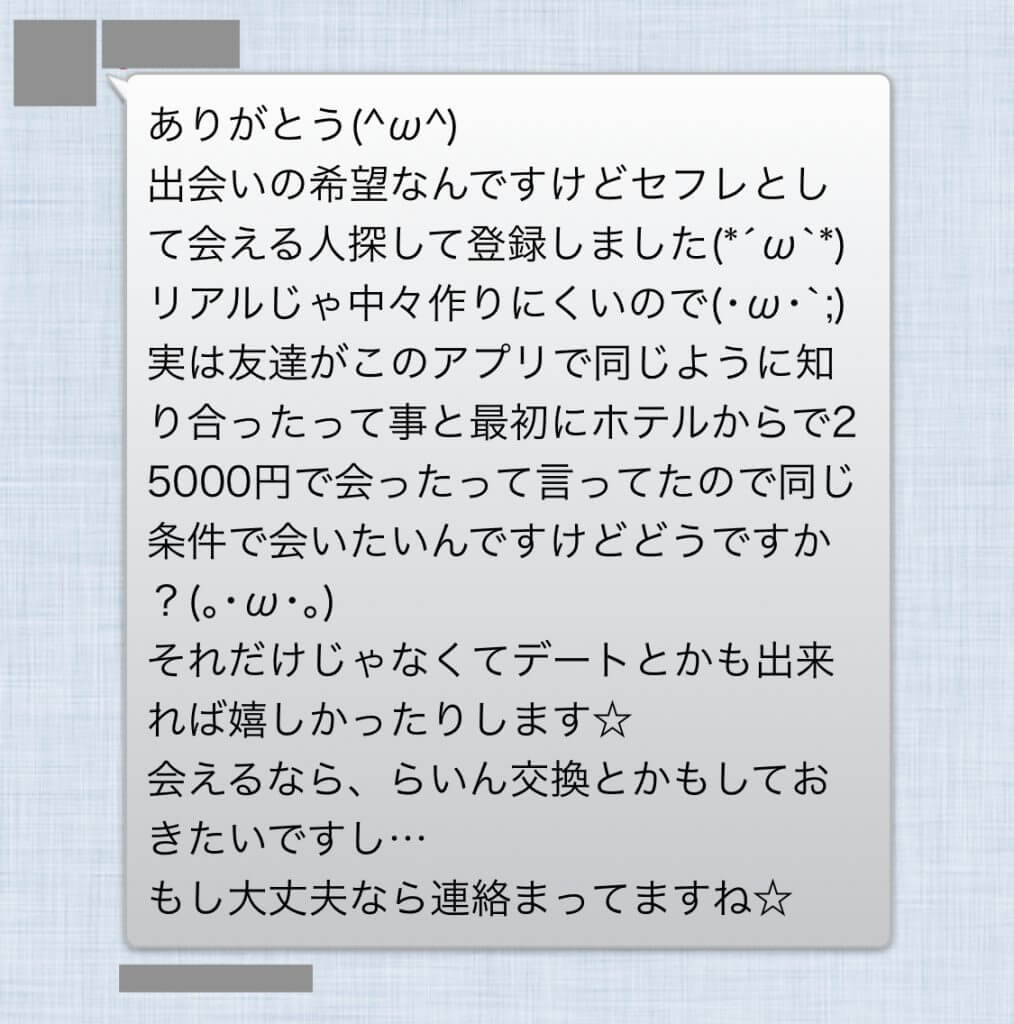 これはセフレとして出会える人を探しているなんて言っていますが、これは全くの嘘。最初にホテルで25000円で会ったらその後連絡が取れなくなってしまうそうです。プロフィール写真の人が来るかどうかも怪しいので、絶対これに騙されないでくださいね。