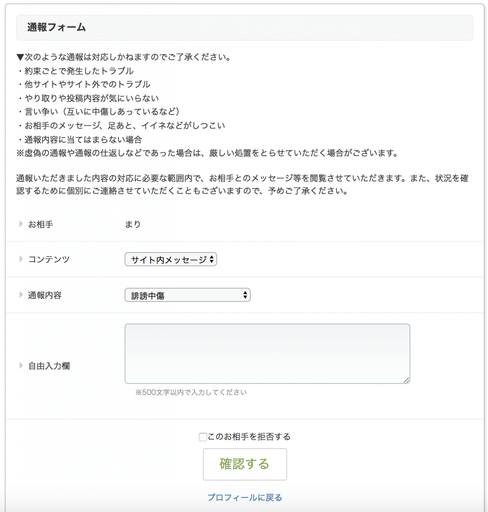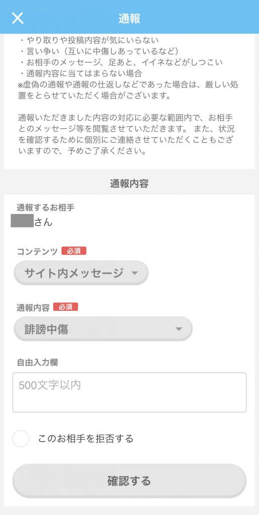 通報フォームが開かれるので、通報したい内容を記入して確認するを押すと送信完了です。