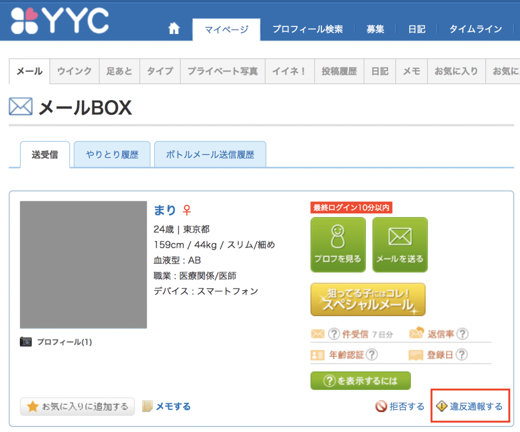 YYCでは通報すると規約違反がないかどうかの確認をして規約に違反していた場合、即座に利用制限等の処分を取ってくれます。業者や不快な言動などをされた場合はすぐに通報してください。